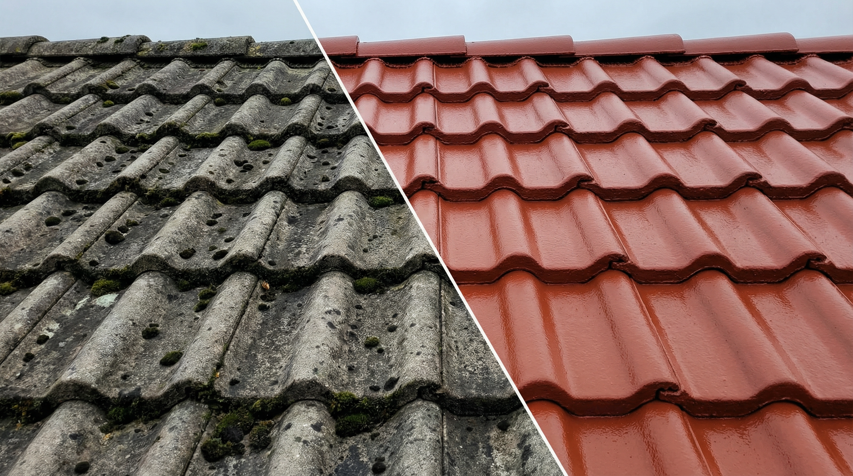 Schonende Hochdruckreinigung entfernt Moos, Algen, Flechten und Schmutz von Ihren Dachziegeln. Ideale Vorbereitung für die Beschichtung.